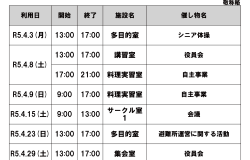 令和5年7月の諸室抽選申込は、5月1日(月)~5月10日(水)までとなります。 優先予約により使用できない諸室のリストを掲示します。 抽選申込時のご参考にしてください。