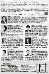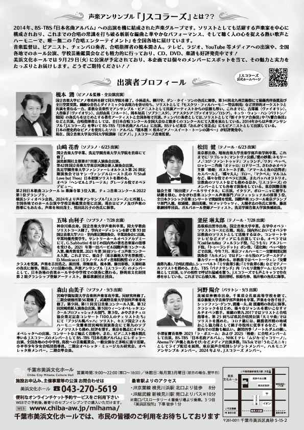 千葉市を拠点に全国各地で活躍するピアニスト榎本潤氏プロデュースによる声楽アンサンブルグループ「Jスコラーズ」。そのメンバーの中から若手アーティストたちが集い、暑い夏にさわやかで伸びやかな歌声を披露します。