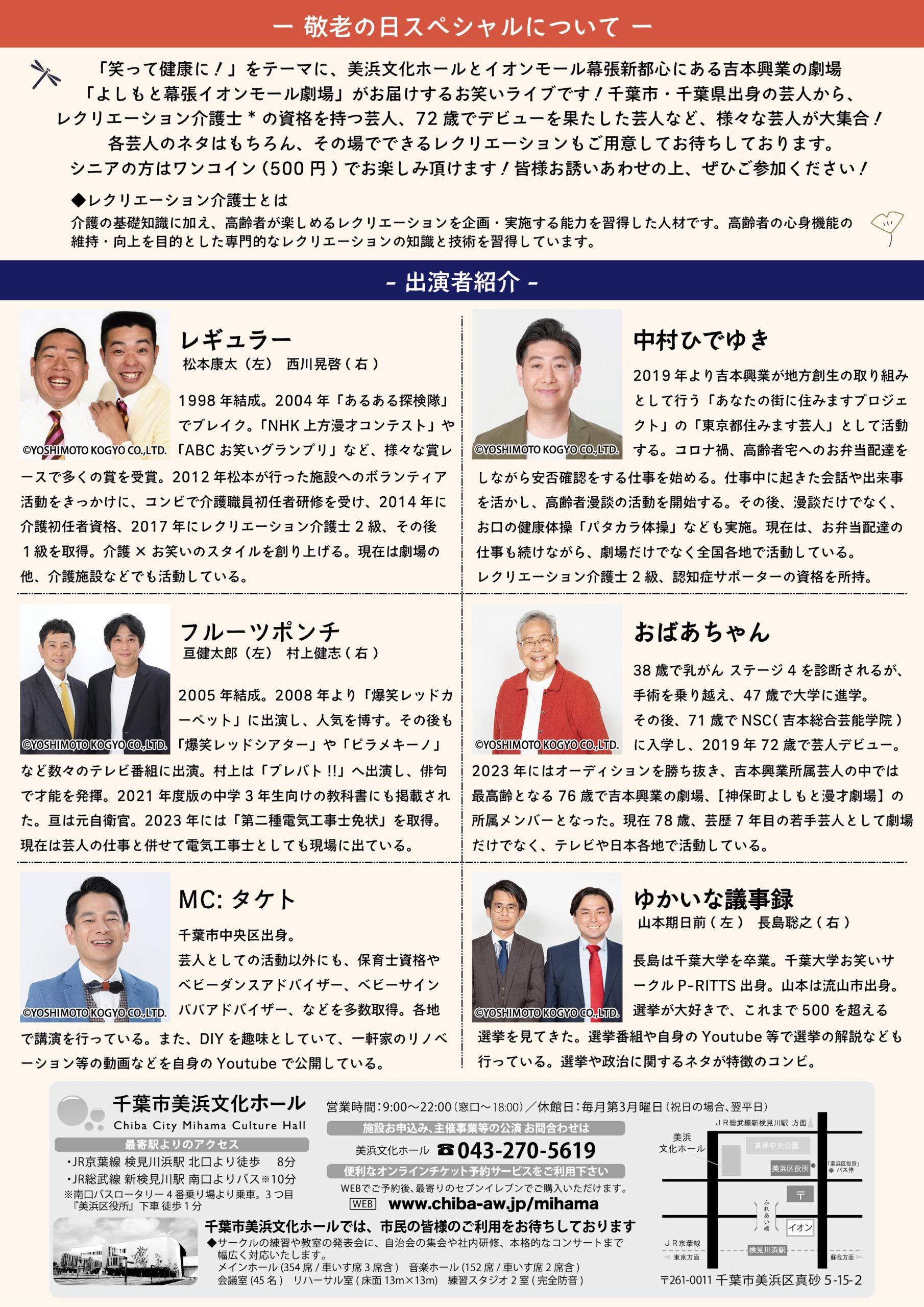 美浜文化ホール×よしもと幕張イオンモール劇場 千葉市出身や千葉大卒、レクリエーション介護士を取得した芸人などが登場! ネタにレクリエーションに、盛りだくさんなお笑いライブです!