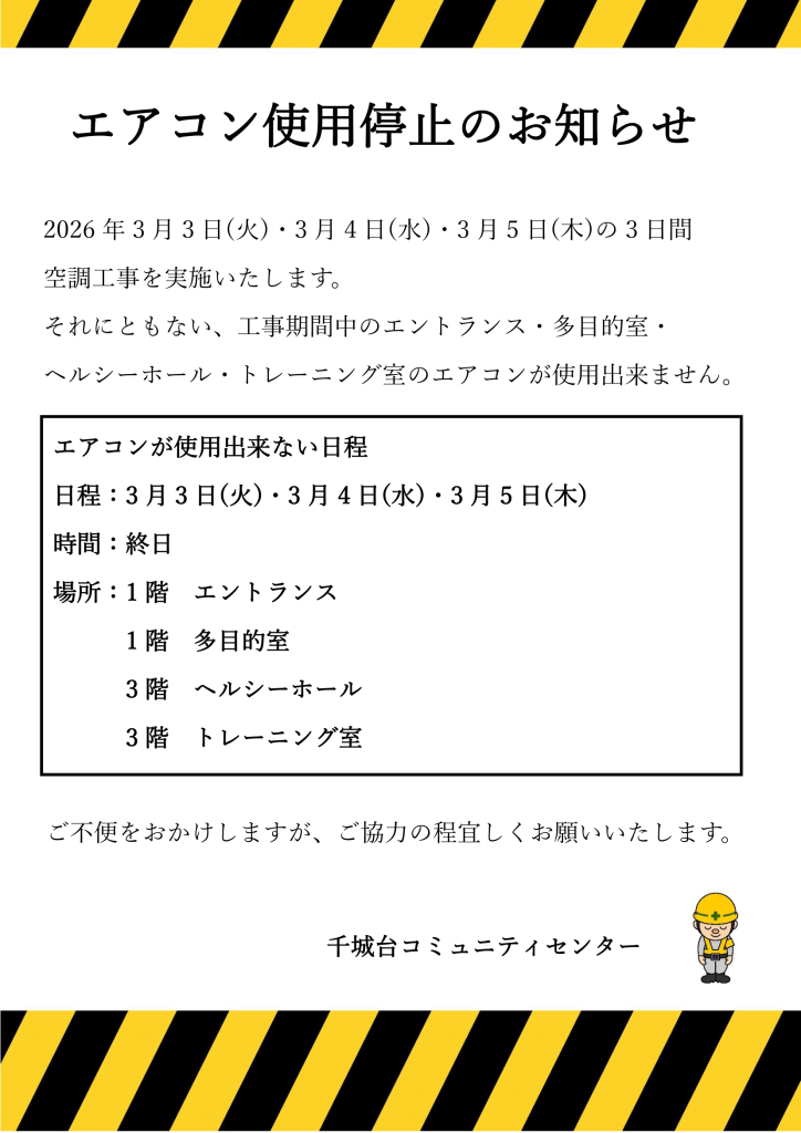 それに伴い、工事期間中の多目的室・ヘルシーホール・トレーニング室の空調が使用いただけません。