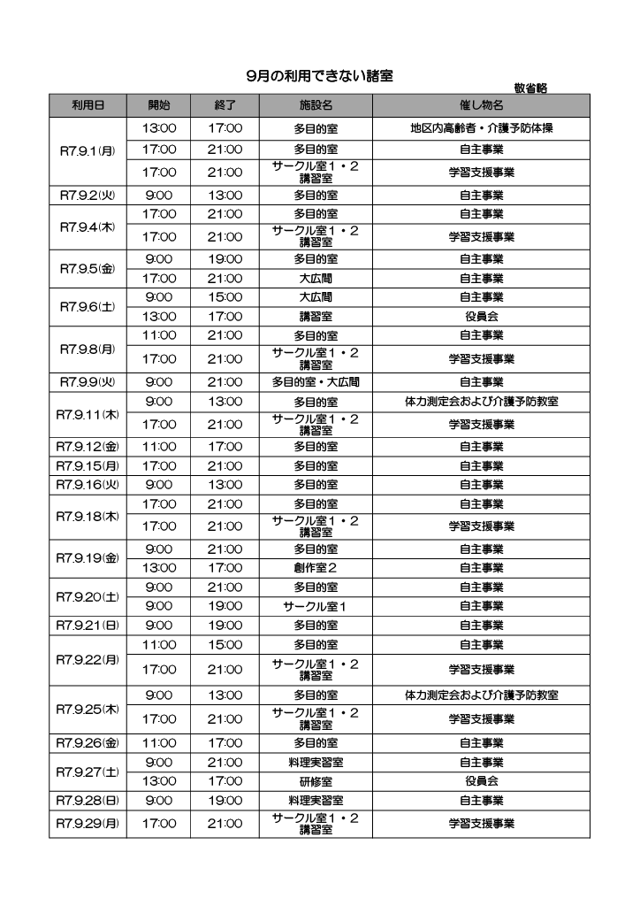 優先予約により使用できない諸室のリストを掲示します。