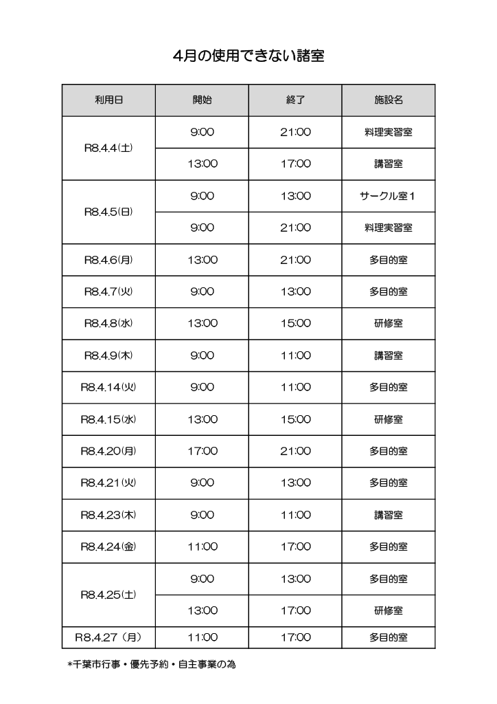 優先予約により使用できない諸室のリストです。抽選申込時のご参考にご利用ください。