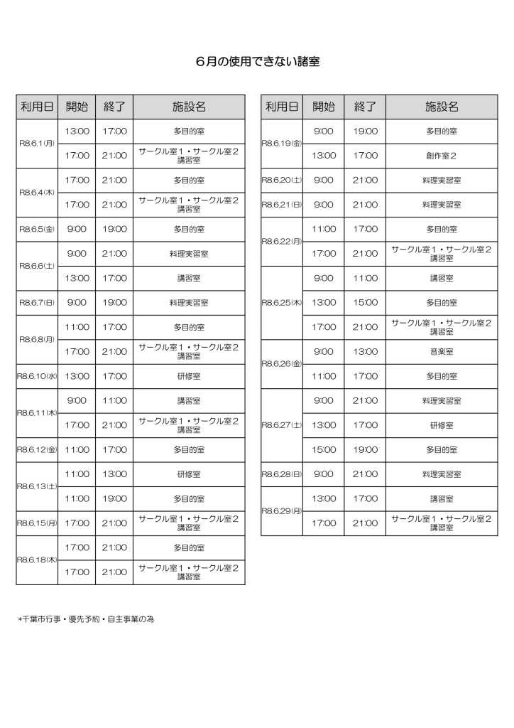 令和8年6月の諸室抽選申込は、4月1日(水)~4月10日(金)までとなります。