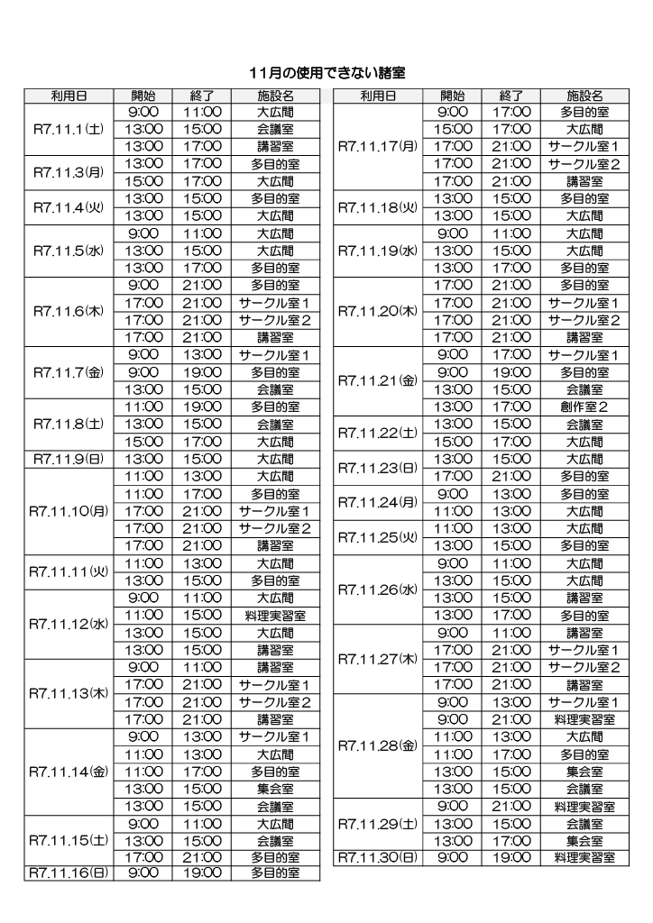 令和7年11月の諸室抽選申込は、9月1日(月)~9月10日(水)までとなります。