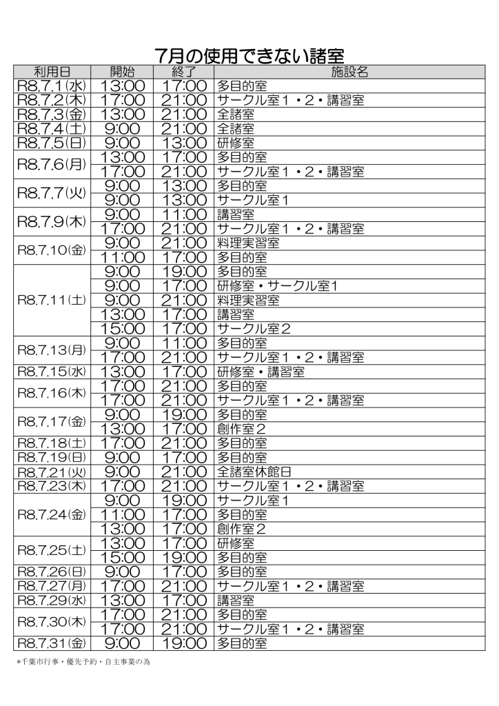 令和8年7月の諸室抽選申込は、5月1日(金)~5月10日(日)までとなります。
