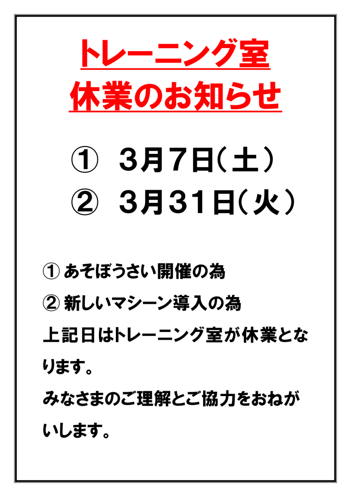 更新【トレーニング室】休業日のご案内